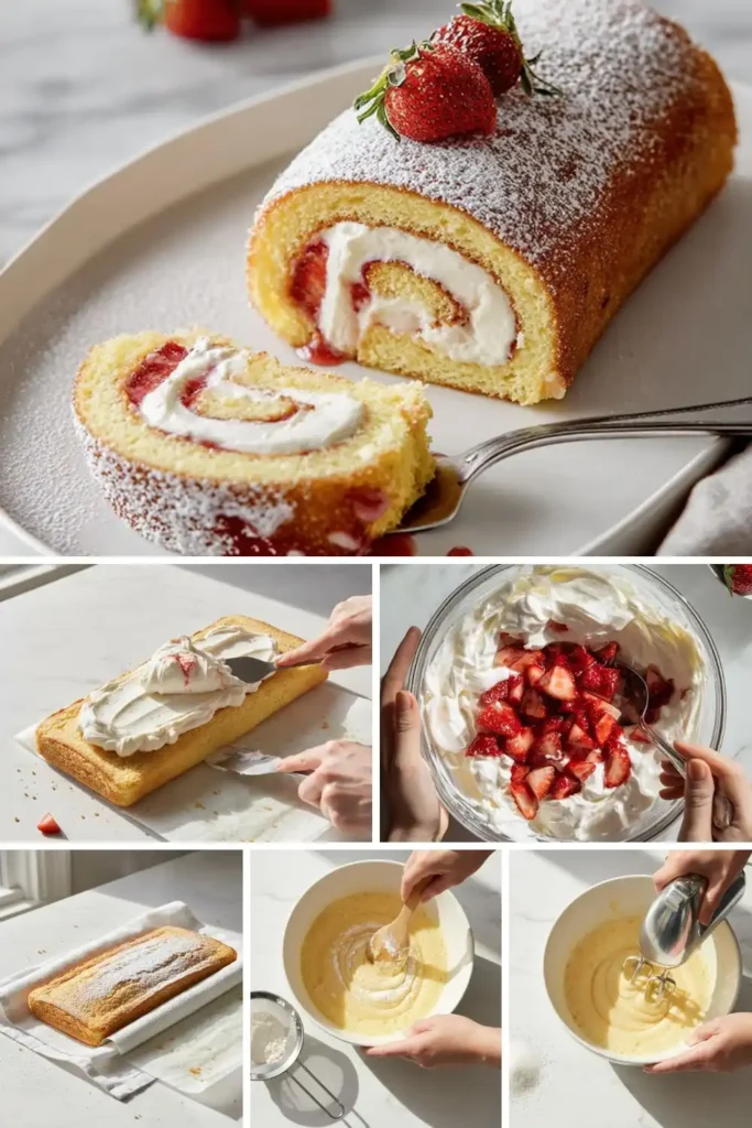 A delicate sponge cake rolled with whipped cream and fresh strawberries—a perfect, showstopping dessert for any occasion.